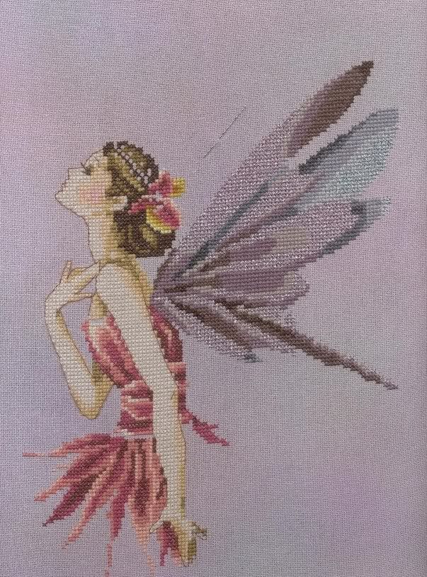 I change the kreinik in the wings for a blending of 1 silver 1 pink metallic threads, and also change the light blue/gray in the wing for a blending of 1 silver 1 light blue metallic thread